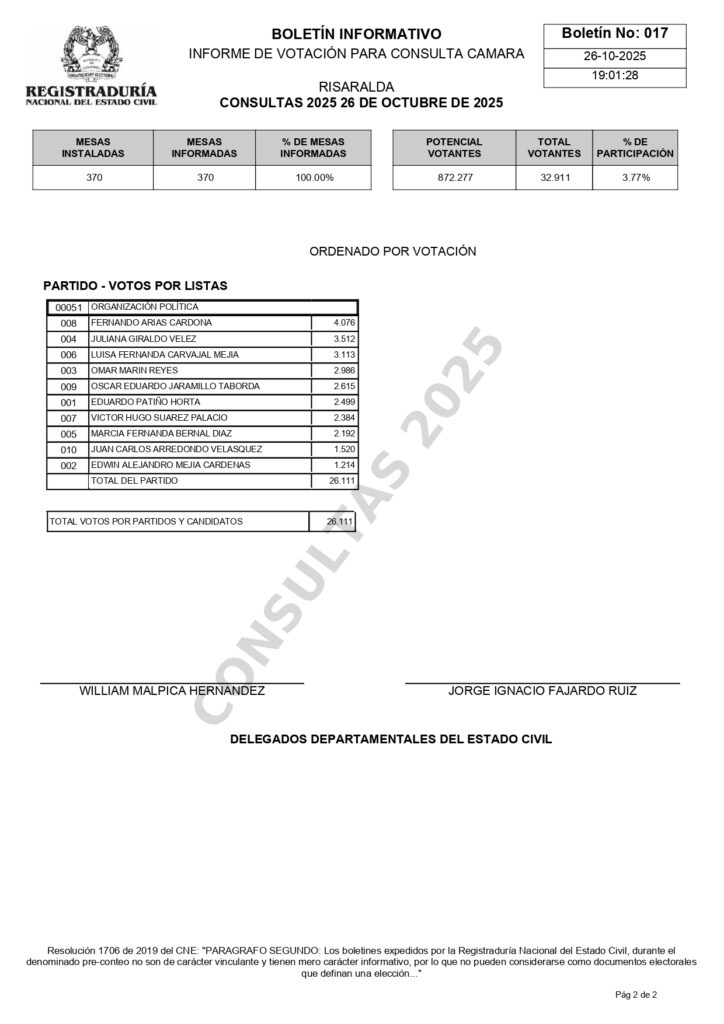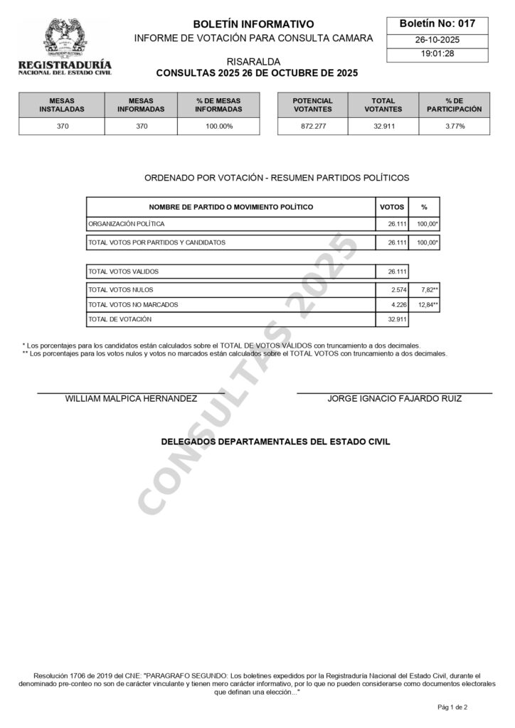 Estos resultados corresponden al preconteo, por lo que tienen carácter informativo y no son vinculantes, según lo establece la Resolución 1706 de 2019 del Consejo Nacional Electoral.