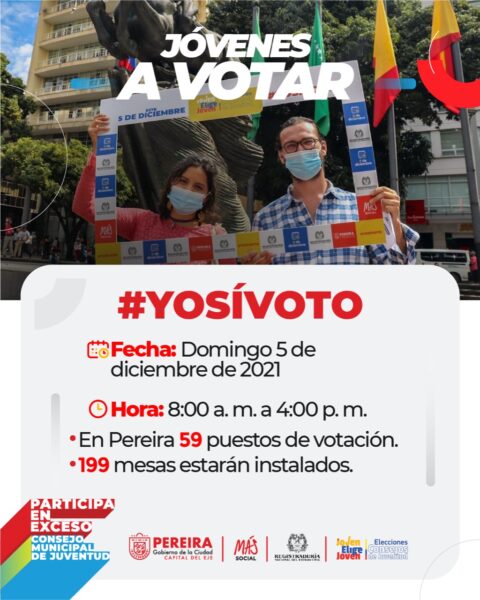 Este domingo 5 de diciembre, desde las 8 a.m. hasta las 4 p.m. los jóvenes de Pereira que hayan inscrito su cédula, entre los 14 a los 28 años; tendrán la oportunidad de asistir a las urnas y elegir a sus líderes en un proceso democrático histórico para la juventud de la ciudad y del país. Su misión será votar por quienes los representarán, harán veeduría, control y gestión ante las ante las instituciones gubernamentales.