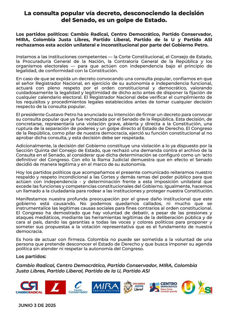 Los partidos políticos Cambio Radical, Centro Democrático, Partido Conservador, MIRA, Colombia Justa Libres, Partido Liberal, Partido de la U y Partido ASI, rechazaron el anuncio del Presidente Gustavo Petro de decretar la consulta popular.
