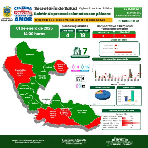 En el departamento de Risaralda el número de afectados por pólvora en diciembre del 2024 fue de 18 personas entre niños, adolescentes y adultos, estas cifra que sigue preocupando, pues el objetivo desde la Secretaría de Salud del Departamento es tener en cero este valor.