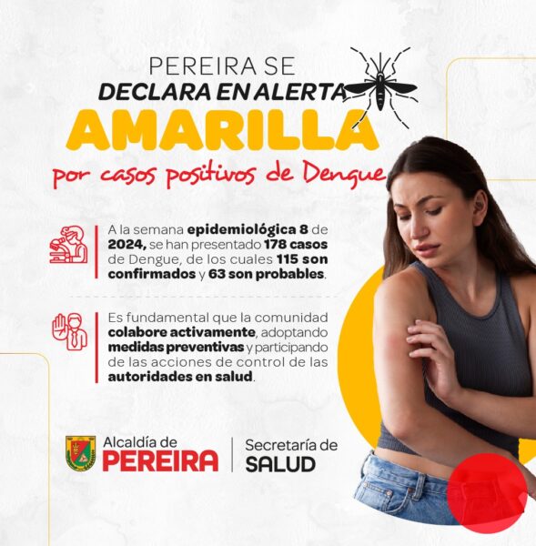 El Alcalde de Pereira Mauricio Salazar, declaró este lunes 11 de marzo la alerta amarilla por brote de dengue en Pereira, teniendo en cuenta el aumento de casos, donde a la semana epidemiológica 8 de 2024 se han presentado 178 casos de dengue, de los cuales 115 son confirmados y 63 son probables.